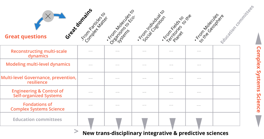 The beauty of such CS roadmaps is that these two ways are creating the above matrix crossing great questions and great classes. The scientific “smartness” of the matrix is to create new scientific communities as transdisciplines, horizontally Complex Systems Science and, vertically, the new integrative and predictive sciences of the great classes: complex matter science, integrative biology and ecology, integrative cognitive science and environmental-social-economy of territories from households & farms to the planet can thus be immediately linked to the the “smartest” responsible innovations respecting the 17 UN Objectives of Sustainable Development for 2030.